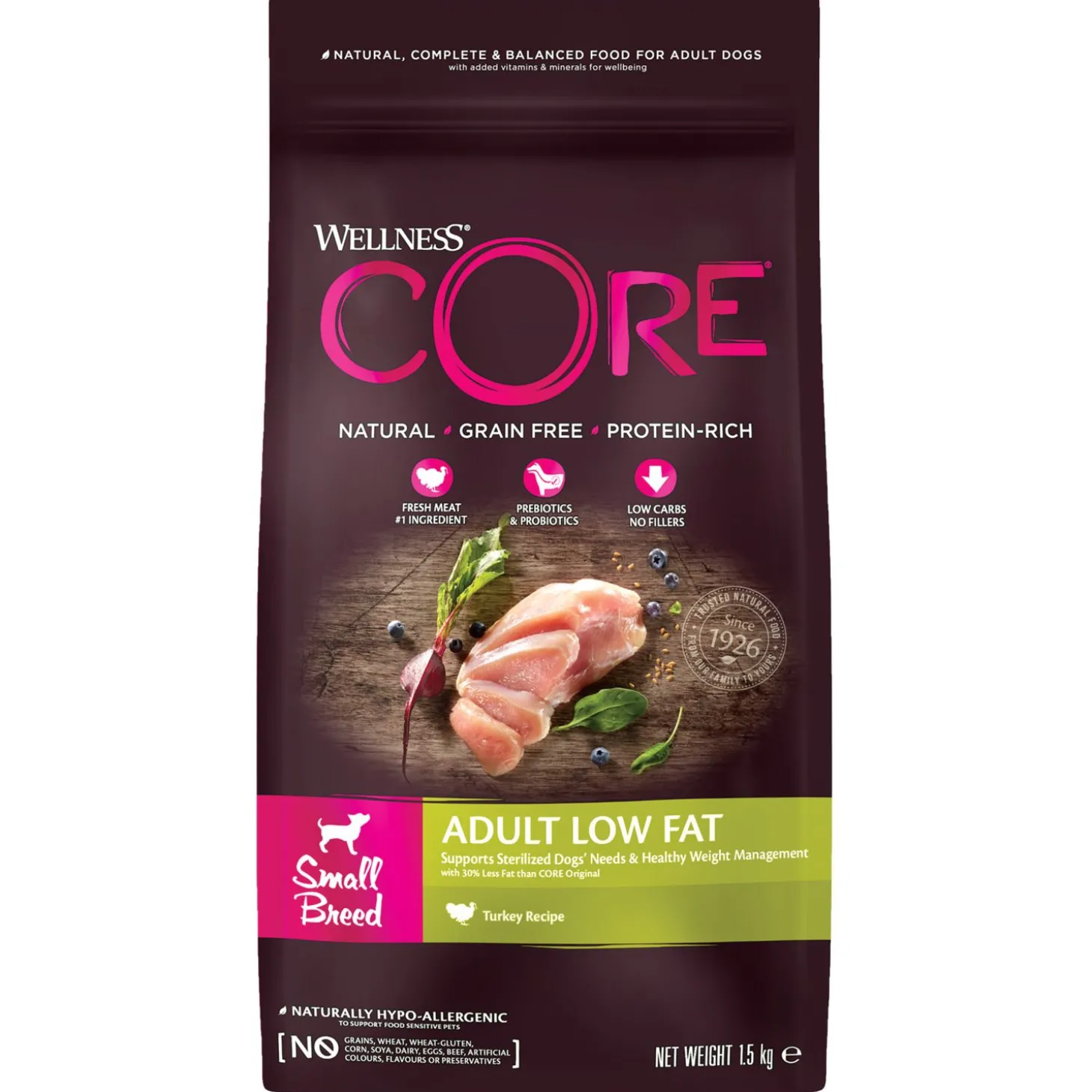 Je wilt je hond natuurlijk de beste van de beste brokken aanbieden. Adult Small Breed Low Fat van Wellness Core is een natuurlijke en complete voeding voor kleine volwassen honden, met toegevoegde vitaminen en mineralen. Een voeding rijk aan proteïnen met vlees of vis dat wordt aangevuld met onder andere superfoods, plantenextracten en voedingssupplementen. De voeding is daarnaast ook nog eens graanvrij.