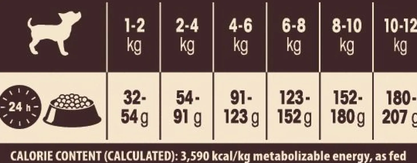 | Aanbeveling | Zie grafiek. Elke hond is een beetje anders, dus de optimale voedingshoeveelheid kan variëren per leeftijd, formaat, activiteitsniveau, ras en omgeving. Deel het totaal aantal grammen per dag door het aantal keren dat u uw hond per dag voert. Gebruik de informatie alleen als een eerste aanbeveling en pas deze zo nodig aan. Bied altijd toegang tot schoon, vers water.COMBINATIE VAN VOEDING: Als u met nat voedsel voert, verminder de droge hoeveelheid met 14 g voor elke 2 eetlepels aan nat voer.BEWAAR HET VOER OP EEN DROGE, KOELE PLEK. Geproduceerd in de EU. Ten minste houdbaar tot, batchcode en erkenningsnummer: zie achterkant van verpakking.CALORIEGEHALTE (BEREKEND): 3330 Kcal/Kg |