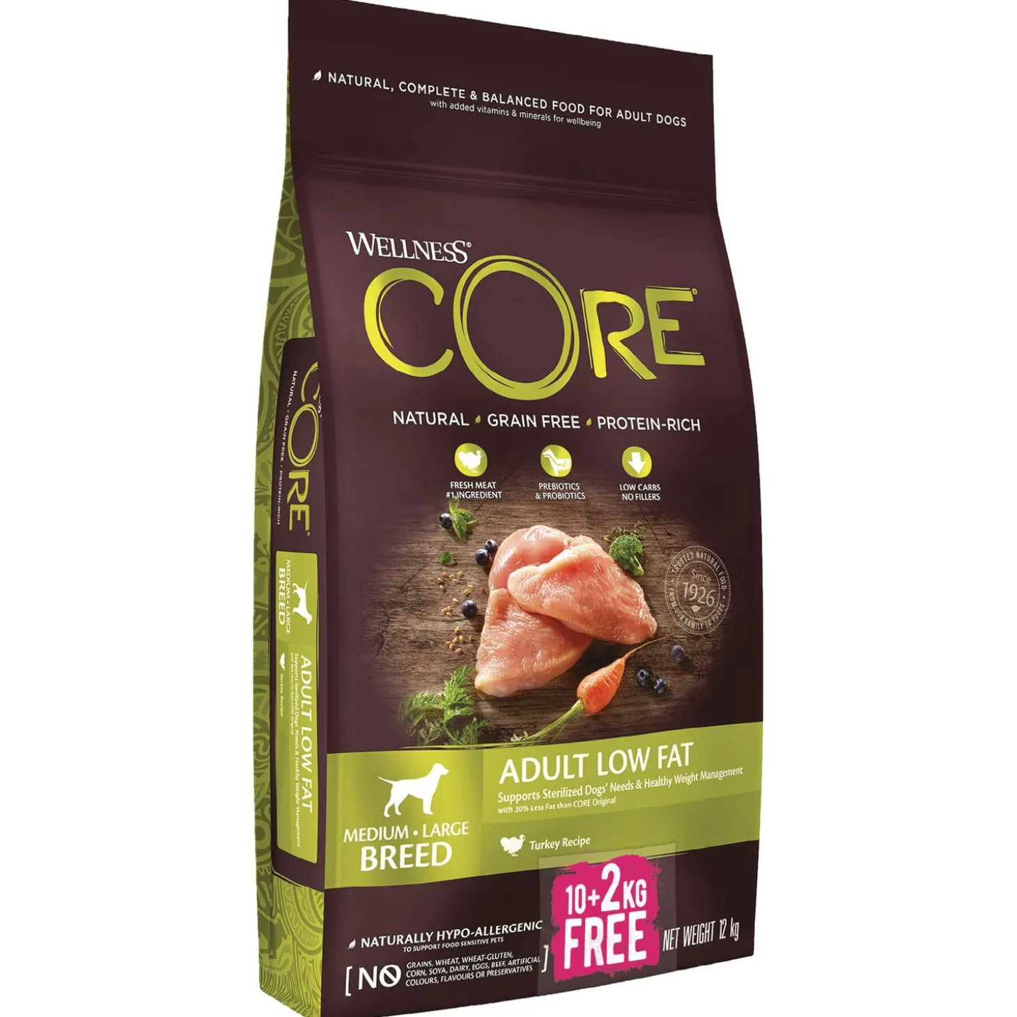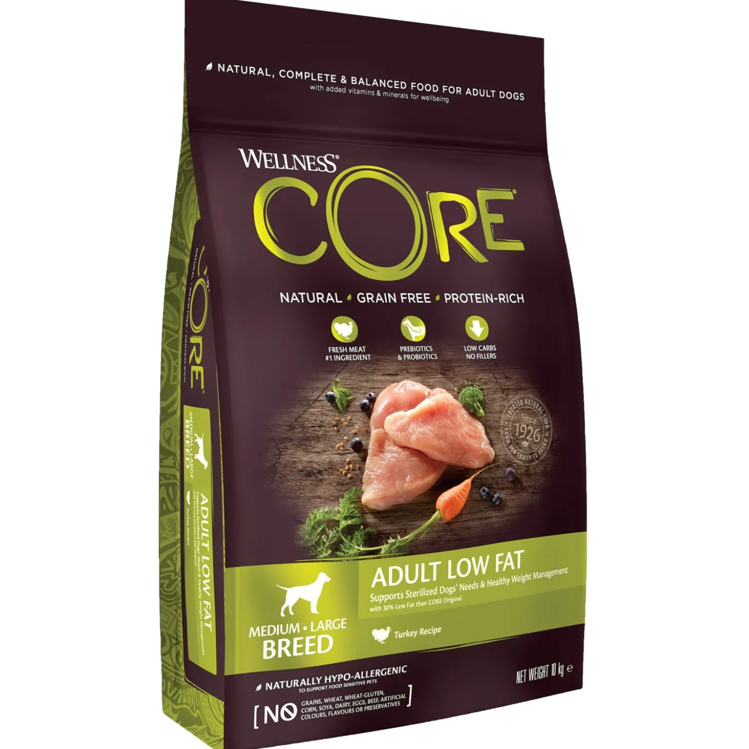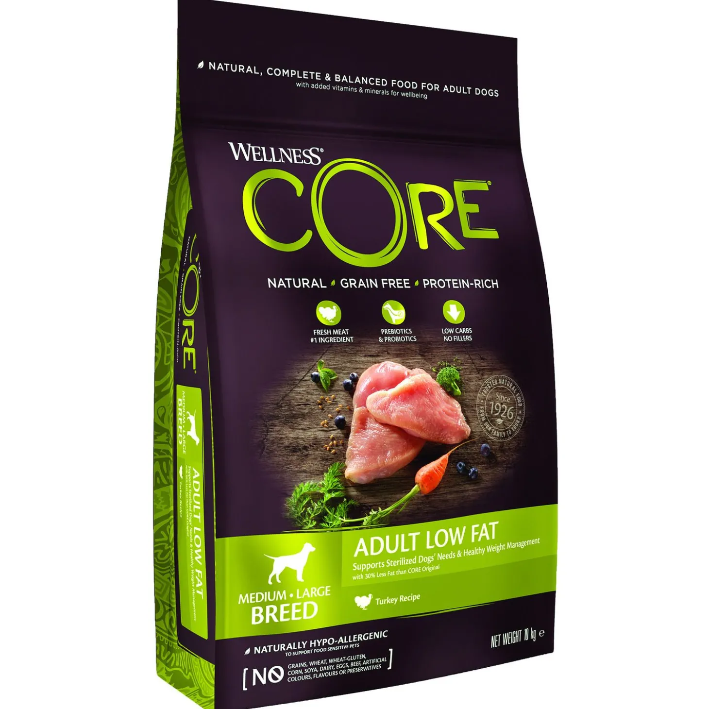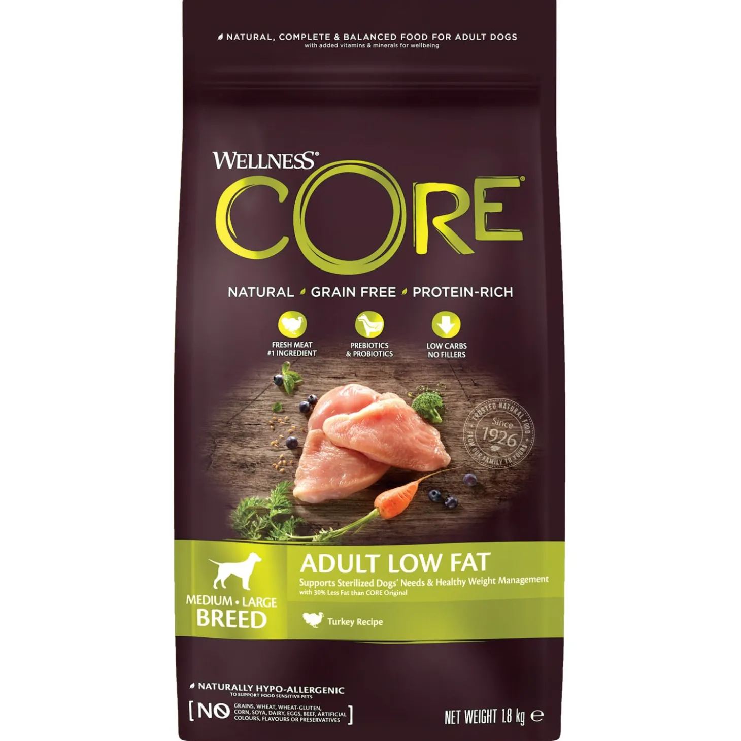 Je wilt je hond natuurlijk de beste van de beste brokken aanbieden. Adult Low Fat Medium-Large Breed van Wellness Core is een natuurlijke en complete voeding voor (middel)grote volwassen honden, met toegevoegde vitaminen en mineralen. Een voeding rijk aan proteïnen met kalkoen die wordt aangevuld met onder andere superfoods, plantenextracten en voedingssupplementen. De voeding is daarnaast ook nog eens graanvrij.