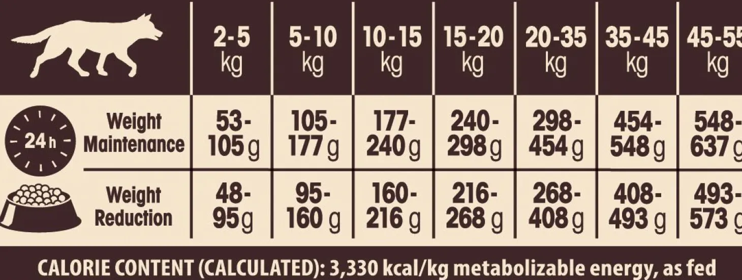 | Aanbeveling | Zie grafiek. Elke hond is een beetje anders, dus de optimale voedingshoeveelheid kan variëren per leeftijd, formaat, activiteitsniveau, ras en omgeving. Deel het totaal aantal grammen per dag door het aantal keren dat u uw hond per dag voert. Gebruik de informatie alleen als een eerste aanbeveling en pas deze zo nodig aan. Bied altijd toegang tot schoon, vers water.HONDEN BOVEN DE 80 KG: Voeg 25 g toe per 5 kg extra gewicht.COMBINATIE VAN VOEDING: Als u met nat voedsel voert, verminder de droge hoeveelheid met 50 g voor elke 170 g aan nat voer.BEWAAR HET VOER OP EEN DROGE, KOELE PLEK. Geproduceerd in de EU. Ten minste houdbaar tot, batchcode en erkenningsnummer: zie achterkant van verpakking.CALORIEGEHALTE (BEREKEND): 3330 Kcal/Kg |