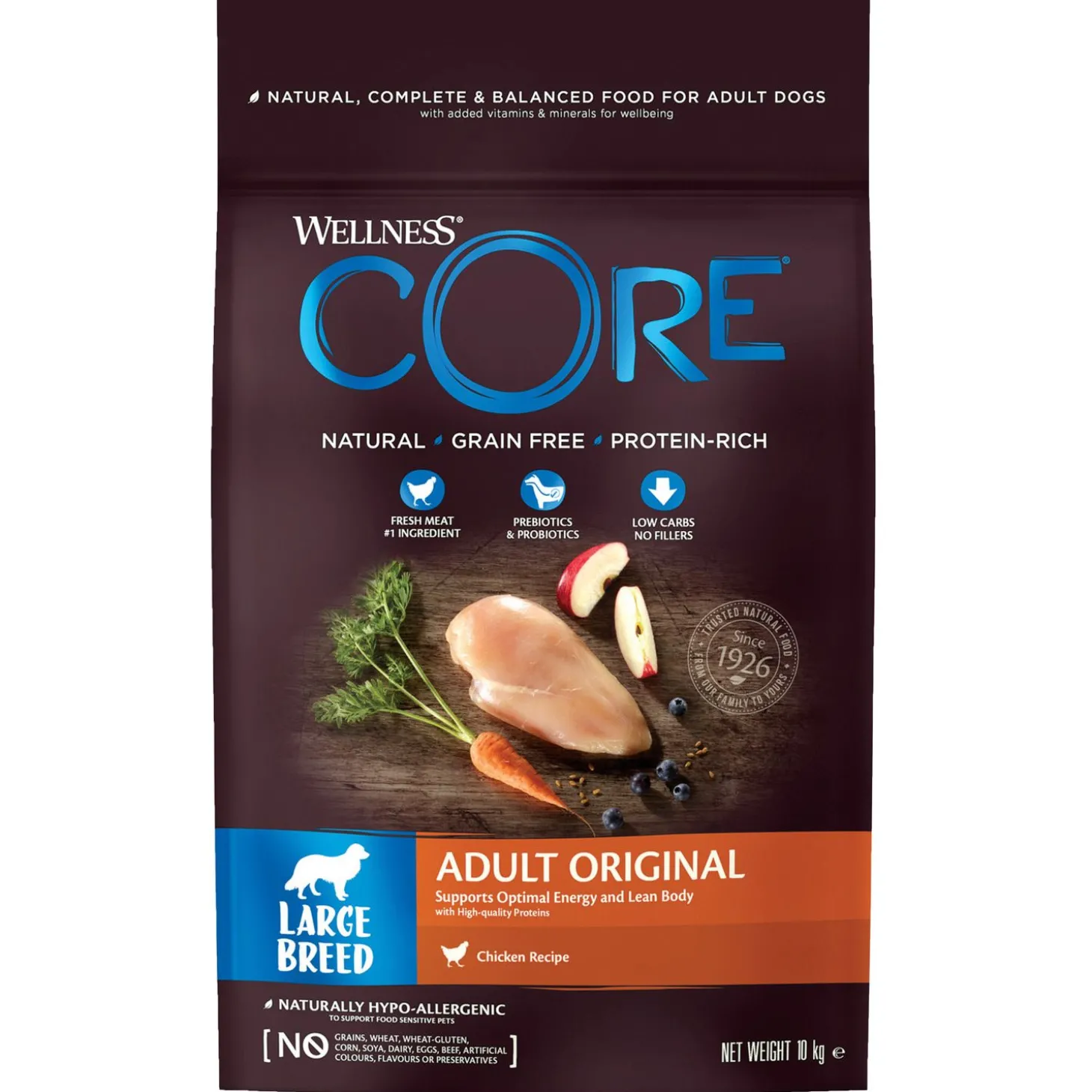 Je wilt je hond natuurlijk de beste van de beste brokken aanbieden. Adult Original Large Breed van Wellness Core is een natuurlijke en complete voeding voor grote volwassen honden, met toegevoegde vitaminen en mineralen. Een voeding rijk aan proteïnen met kip dat wordt aangevuld met onder andere superfoods, plantenextracten en voedingssupplementen. De voeding is daarnaast ook nog eens graanvrij.