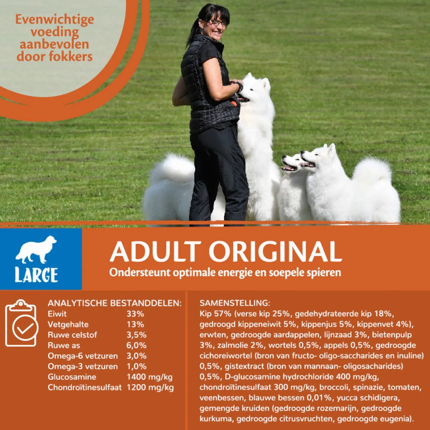 Adult Original Large Breed is verkrijgbaar in 10 kg en 10+2 kg.