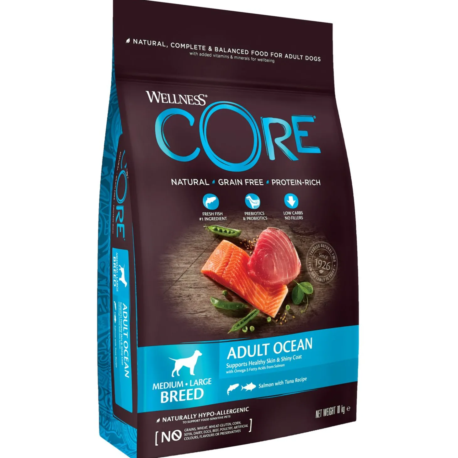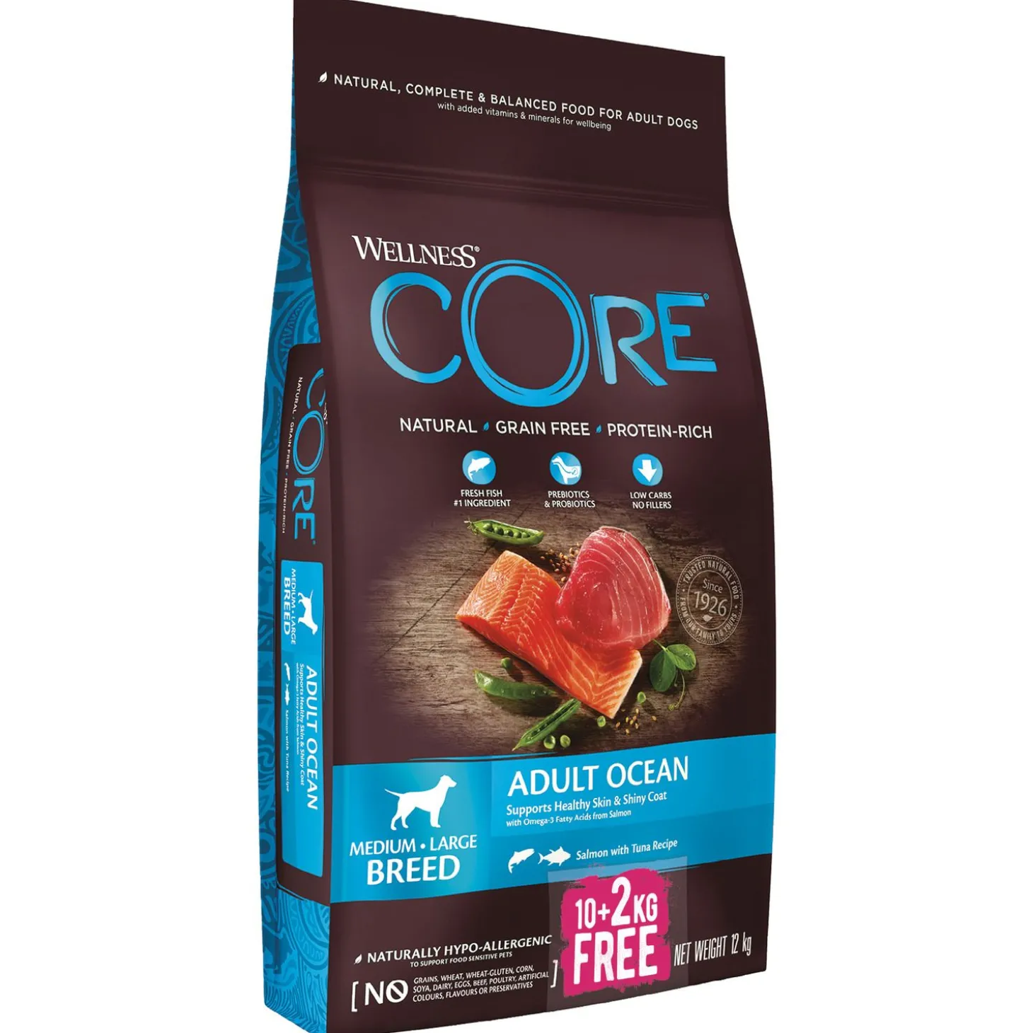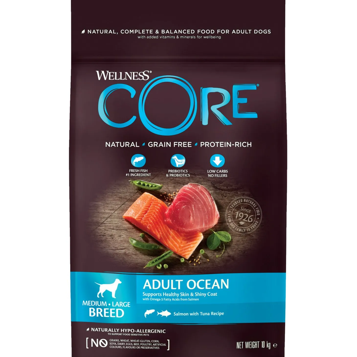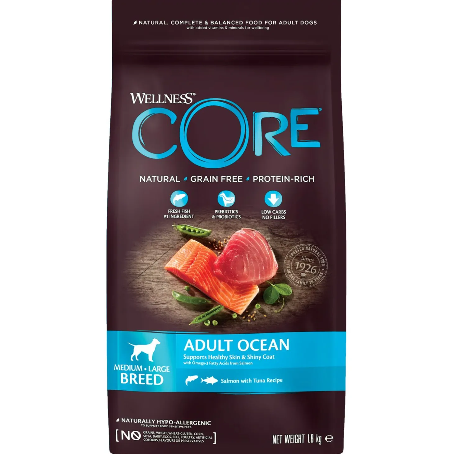 Je wilt je hond natuurlijk de beste van de beste brokken aanbieden. Adult Ocean Medium Breed van Wellness Core is een natuurlijke en complete voeding voor middelgrote volwassen honden, met toegevoegde vitaminen en mineralen. Een voeding rijk aan proteïnen met zalm en tonijn dat wordt aangevuld met onder andere superfoods, plantenextracten en voedingssupplementen. De voeding is daarnaast ook nog eens graanvrij.