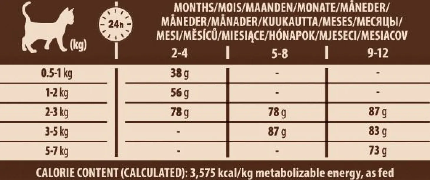| Aanbeveling | VOEDINGSRICHTLIJNEN: Zie tabel. Deel het totaal aantal grammen per dag door het aantal keren dat u uw kitten per dag voert. Gebruik de informatie alleen als een eerste aanbeveling en pas deze zo nodig aan. Bied altijd toegang tot schoon, vers water. CALORIEGEHALTE (BEREKEND): 3663 Kcal/Kg of 366 Kcal/Kopje ME (Metaboliseerbare Energie). |