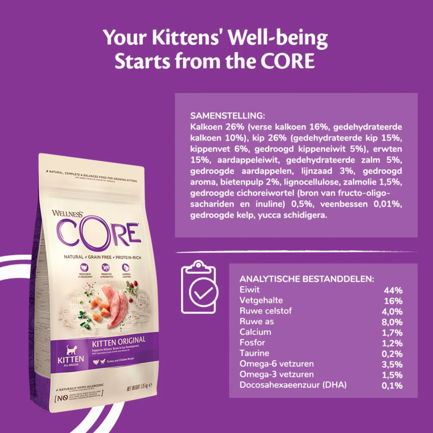 Je wilt je kitten natuurlijk de beste van de beste brokken aanbieden. Wellness Core Kitten is een natuurlijke en complete voeding voor kittens, met toegevoegde vitaminen en mineralen. Een voeding rijk aan proteïnen met verse kalkoen en kip dat wordt aangevuld met onder andere gezonde groenten, superfoods, kruiden en voedingssupplementen. De voeding is daarnaast ook nog eens graanvrij.