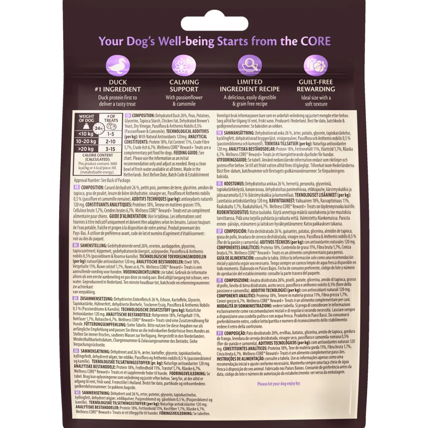 | Samenstelling | Gedehydrateerde Eend 26%, Erwten, Aardappelen, Glycerine, Tapiocazetmeel, Kippenvet, Gedehydrateerde Biergist, Passiflora & Anthemis Nobilis 0,5% (Passiebloem & Kamille). |