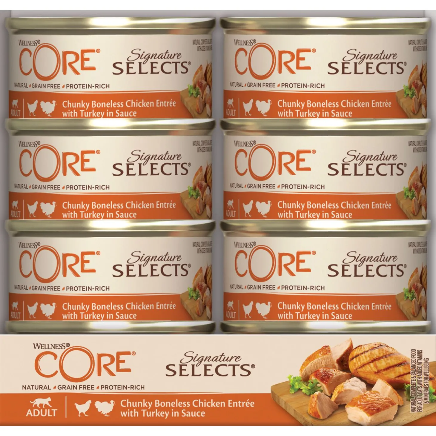 Wellness Core Signature Selects is volledig hypoallergeen, het bevat geen granen, tarwe, gluten maïs, soja, zuivel en ook geen kunstmatige geur-, kleur- en smaakstoffen. Een heerlijke vleesrijke maaltijd waar je kat volop van zal genieten.