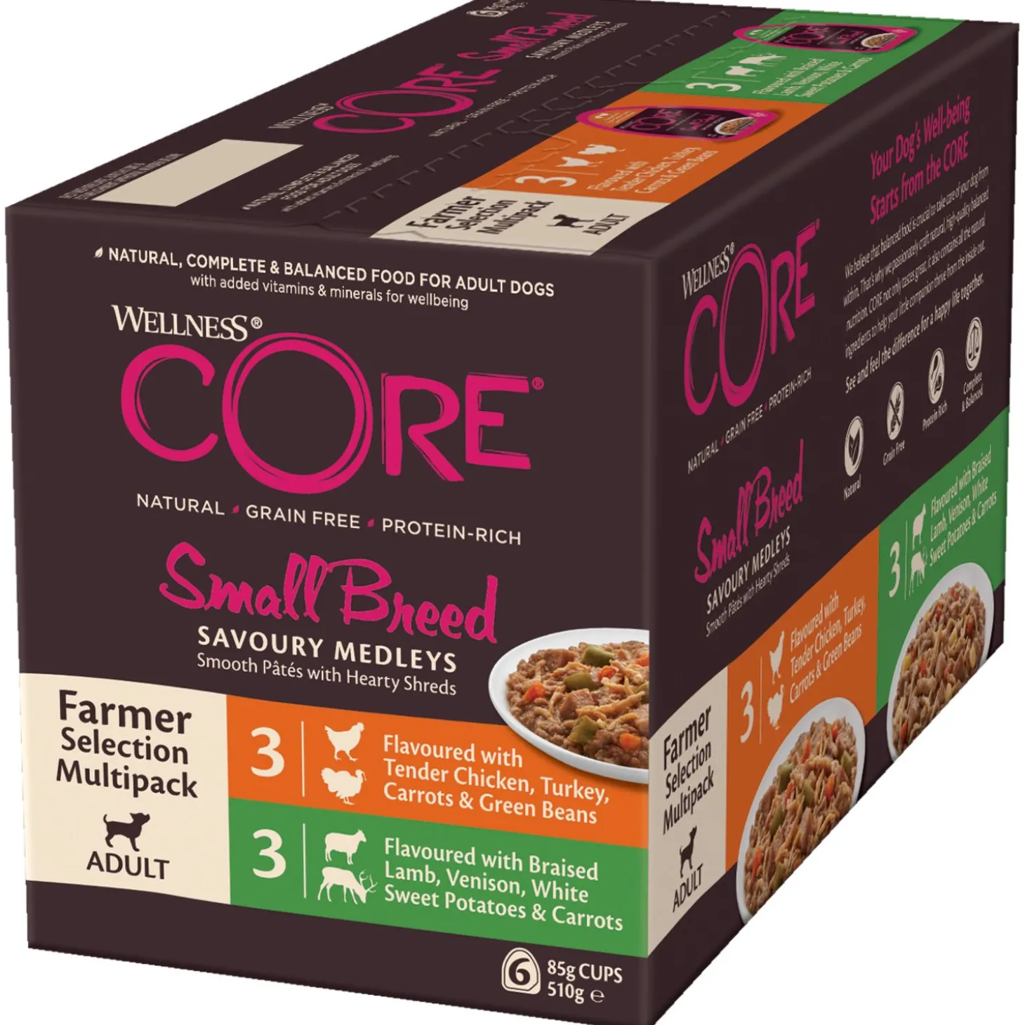 Je wilt je hond natuurlijk het beste van het beste vlees aanbieden. Small Breed Savoury Medleys Farmer Selection Multipack van Wellness Core is een graanvrije natvoeding voor volwassen honden van kleine rassen. Een voeding rijk aan proteïnen met vlees of gevogelte dat wordt aangevuld met alle benodigde groenten, fruit, vitamines, mineralen en antioxidanten. Geschikt voor kleine honden(<12 kg) in alle levensfases.