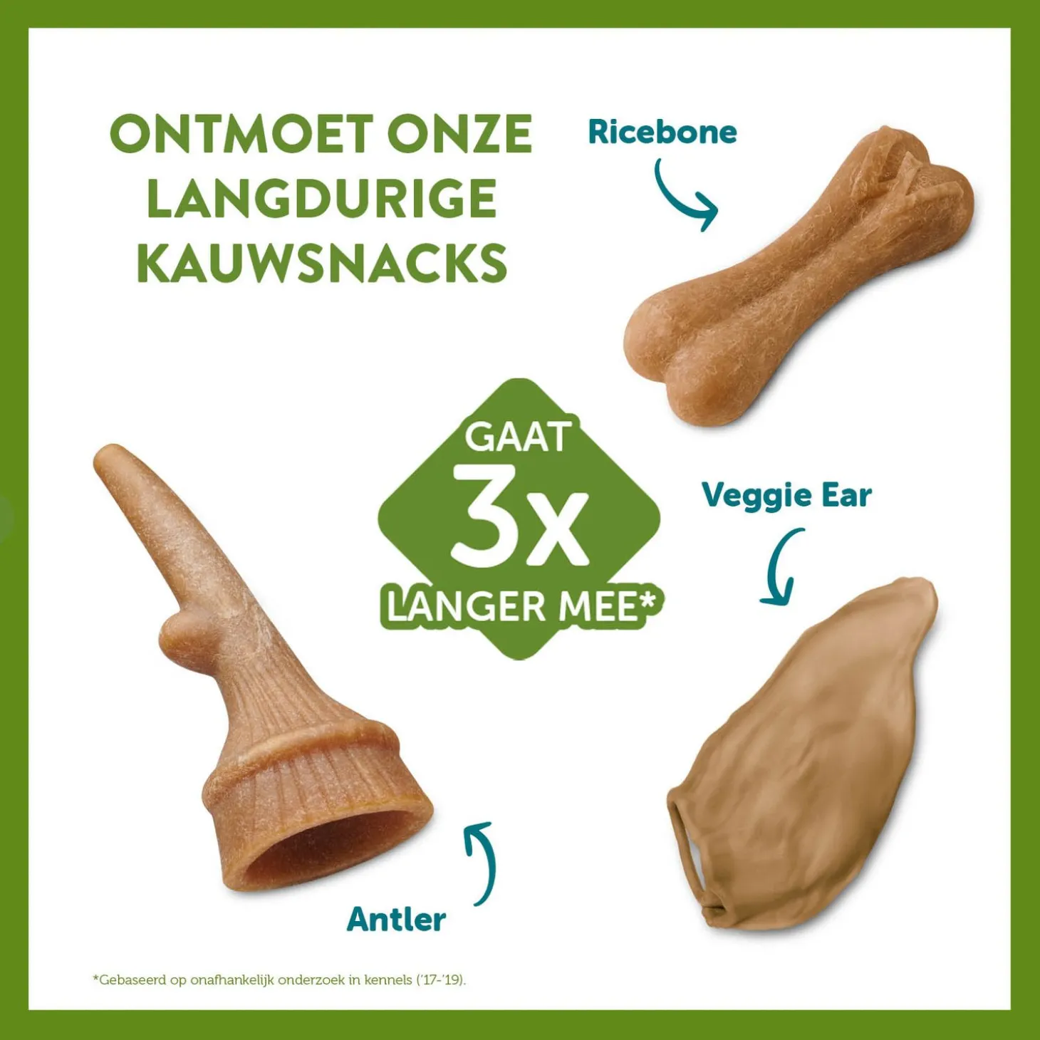 De unieke vorm van de Whimzees Antler zorgt voor extra uitdaging en kauwplezier. Je hond blijft langer kauwen wat nóg beter is voor het gebit. Daarnaast bevat de snack kamille extract voor een kalmerende werking.
