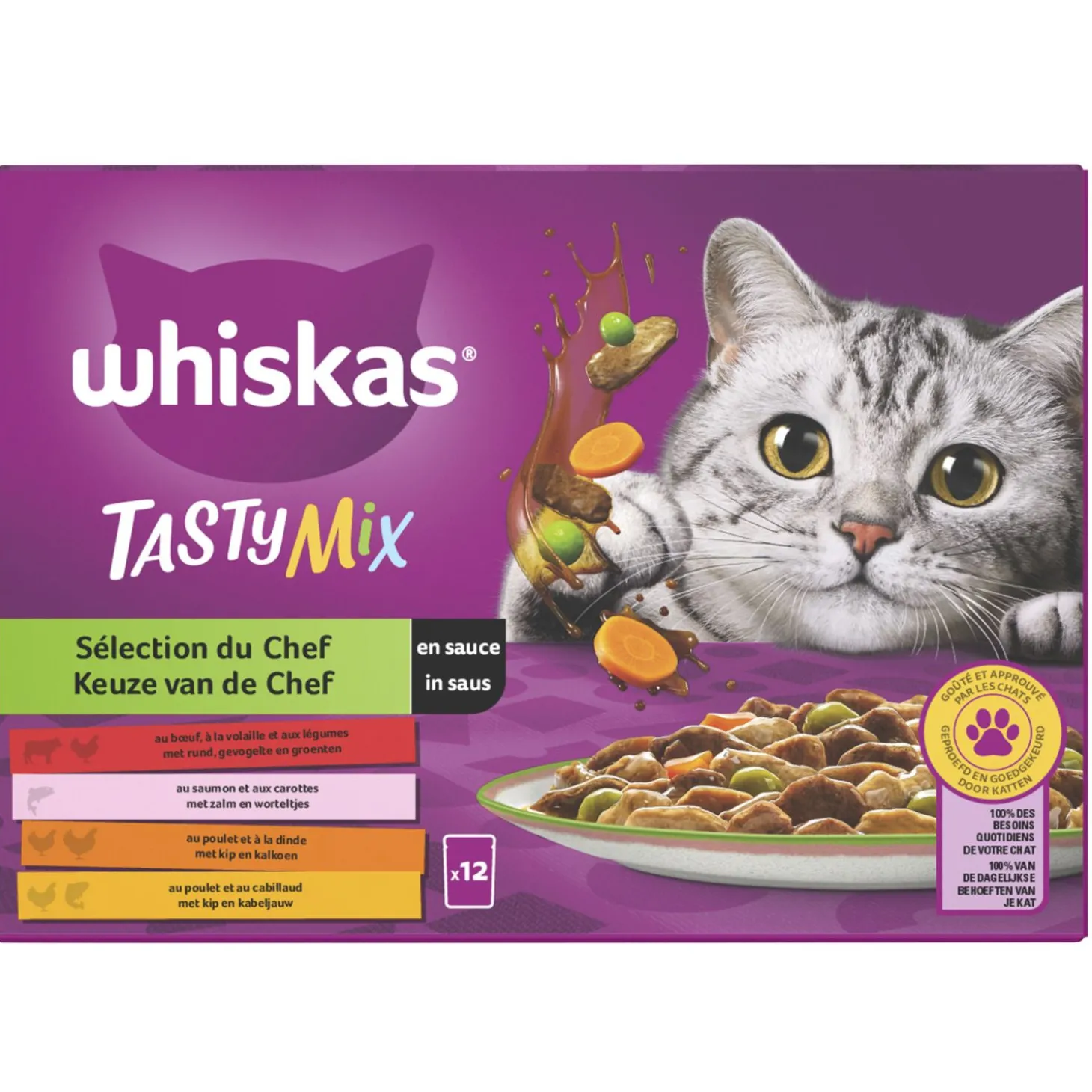 Verras je kat met onze heerlijke Tasty Mix Keuze van de Chef recepten in saus met vlees en/of vis met toegevoegde groenten voor meer variatie in iedere maaltijd en een waanzinnige smaaksensatie die zelfs de meest kieskeurige katten niet kunnen weerstaan! In de smaken rundvlees & gevogelte met tuingroenten, zalm & wortelen, kip & witvis, en witvis & tuingroenten. Onze favoriete maaltijden zijn speciaal bereid om al het goede en natuurlijke van de overheerlijke hoge kwaliteit ingrediënten te behouden, waardoor je kat sneller dan ooit naar het voerbakje zal rennen!