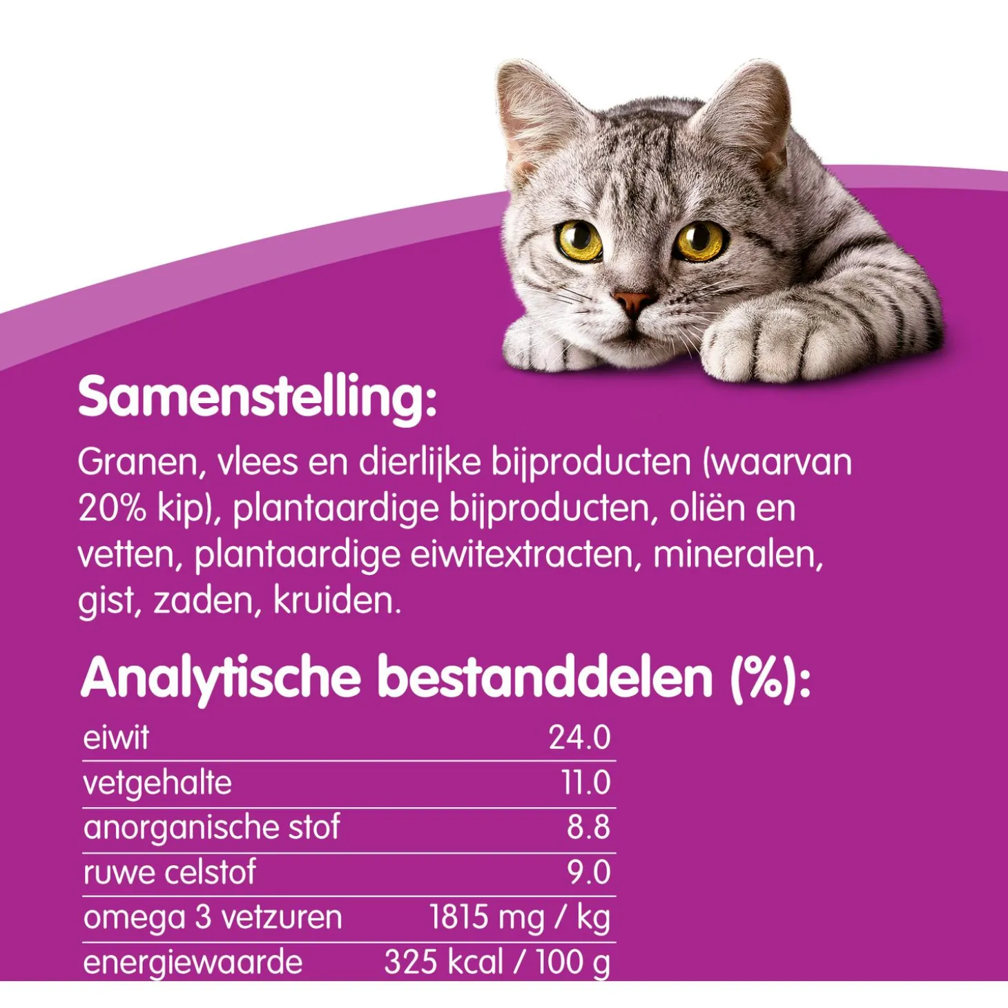 | Samenstelling | Samenstelling: granen, vlees en dierlijke bijproducten (waarvan kip 18%), plantaardige eiwitextracten, plantaardige bijproducten, oliën en vetten, mineralen, gist. |