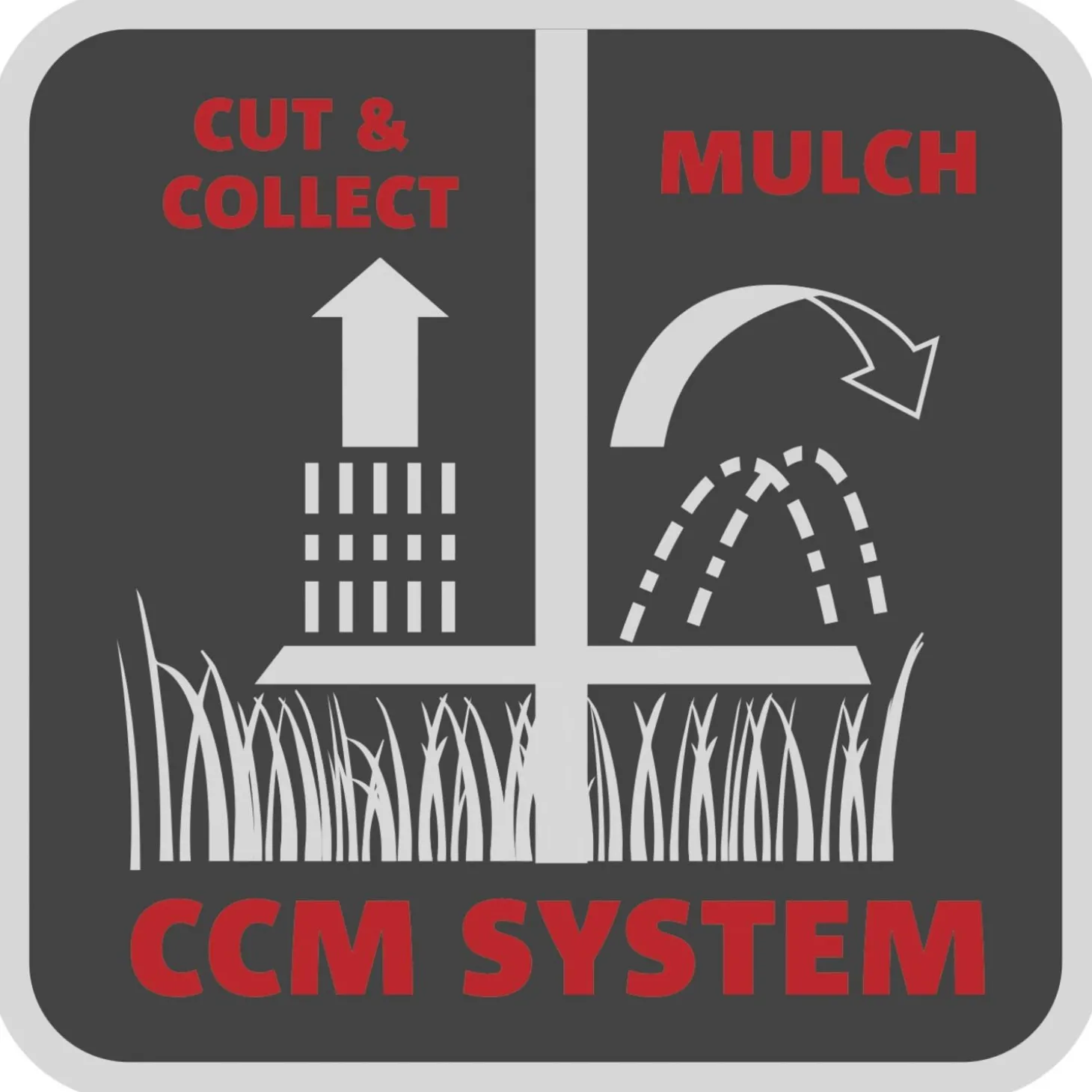 CCM, of voluit cut collect and mulch, vormt je maaier door een simpele draai aan de knop om van een machine met grasopvang naar een mulchmaaier, zonder dat een extra mulchplug nodig is. Het CCM-systeem vind je terug op een selectie van elektrische en accumaaiers (A340 E, A370 E, A 400 E, Lycos 40V 34 37 en 40 cm).