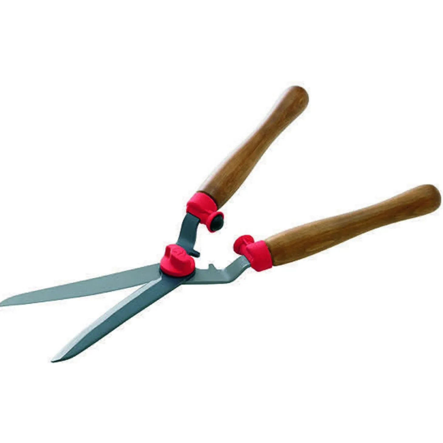 Deze heggenschaar heeft gebogen, dubbel geslepen messen met antikleeflaag die zorgen dat de tak niet wegglijdt tijdens het knippen en die voorkomen dat snoeiafval blijft plakken. Ook heeft de heggenschaar een instelbare messpanning. De handvaten zijn gemaakt van hout, zijn ergonomisch gevormd en bevatten schokabsorberende stootbuffers. De heggenschaar is uitgevoerd met een takkenknipper, waardoor ook dikke takken geen probleem zijn voor deze schaar.