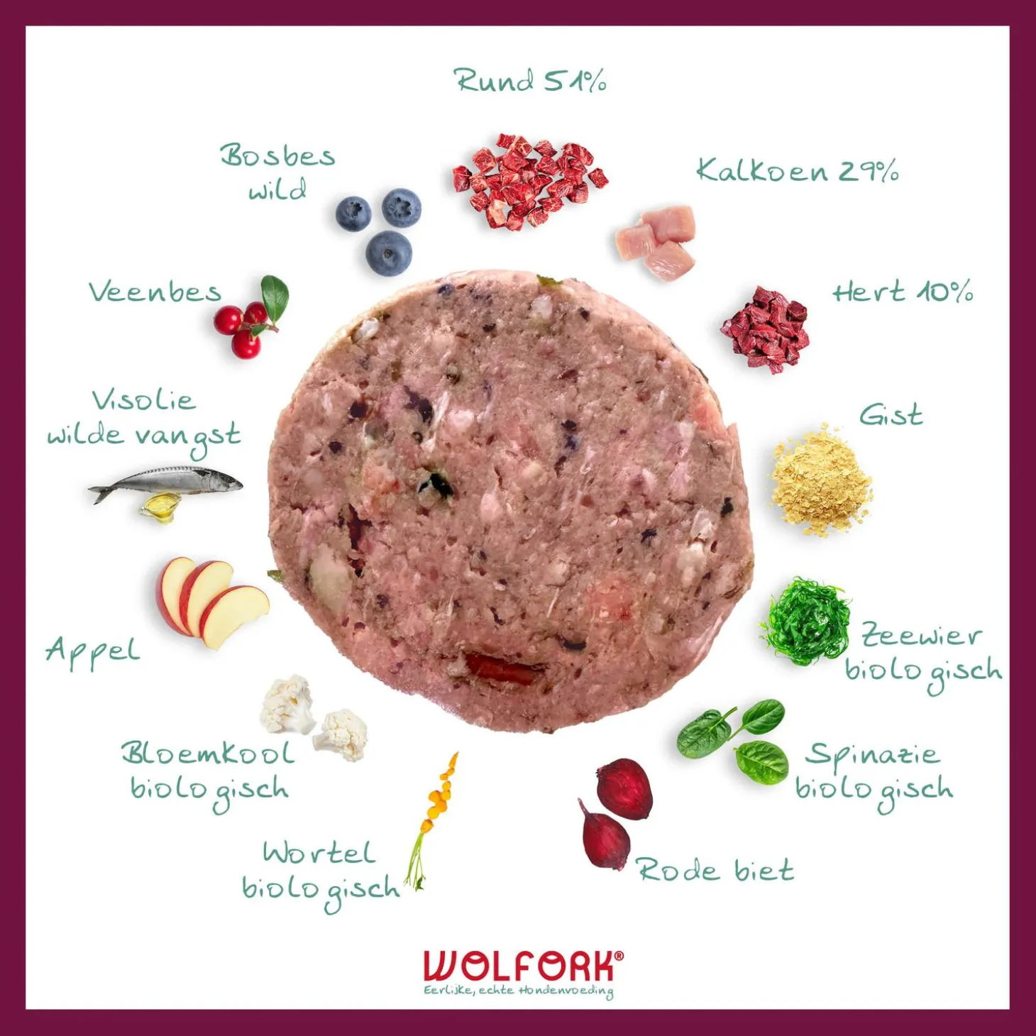 | Samenstelling | Rund (51%); trimming, lever, milt. Kalkoen (29%); separator vlees, bevleesd karkas, maag. Hert (10%); trimming. Overig (10%); gist, zeewier (biologisch), spinazie (biologisch), rode biet, wortel (biologisch), bloemkool (biologisch), appel, visolie (wilde vangst), veenbes, bosbes (wild). |