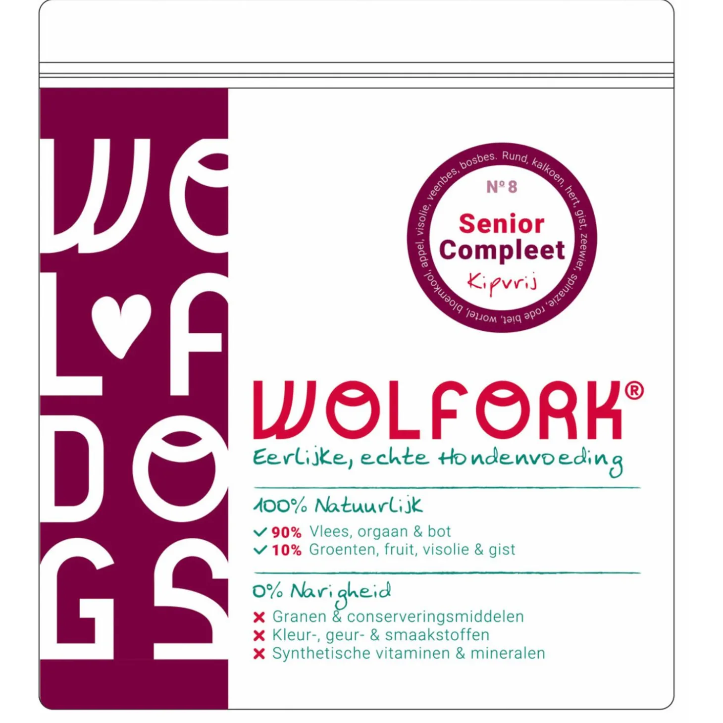 Wolfork №8 Senior Compleet | Kipvrij biedt alles wat jouw oudere hond nodig heeft: veel vers vlees, zonder kip en zonder synthetische toevoegingen. Zorg voor vitaliteit, smaak en een gezonde oude dag. Bestel direct voor een blije senior!