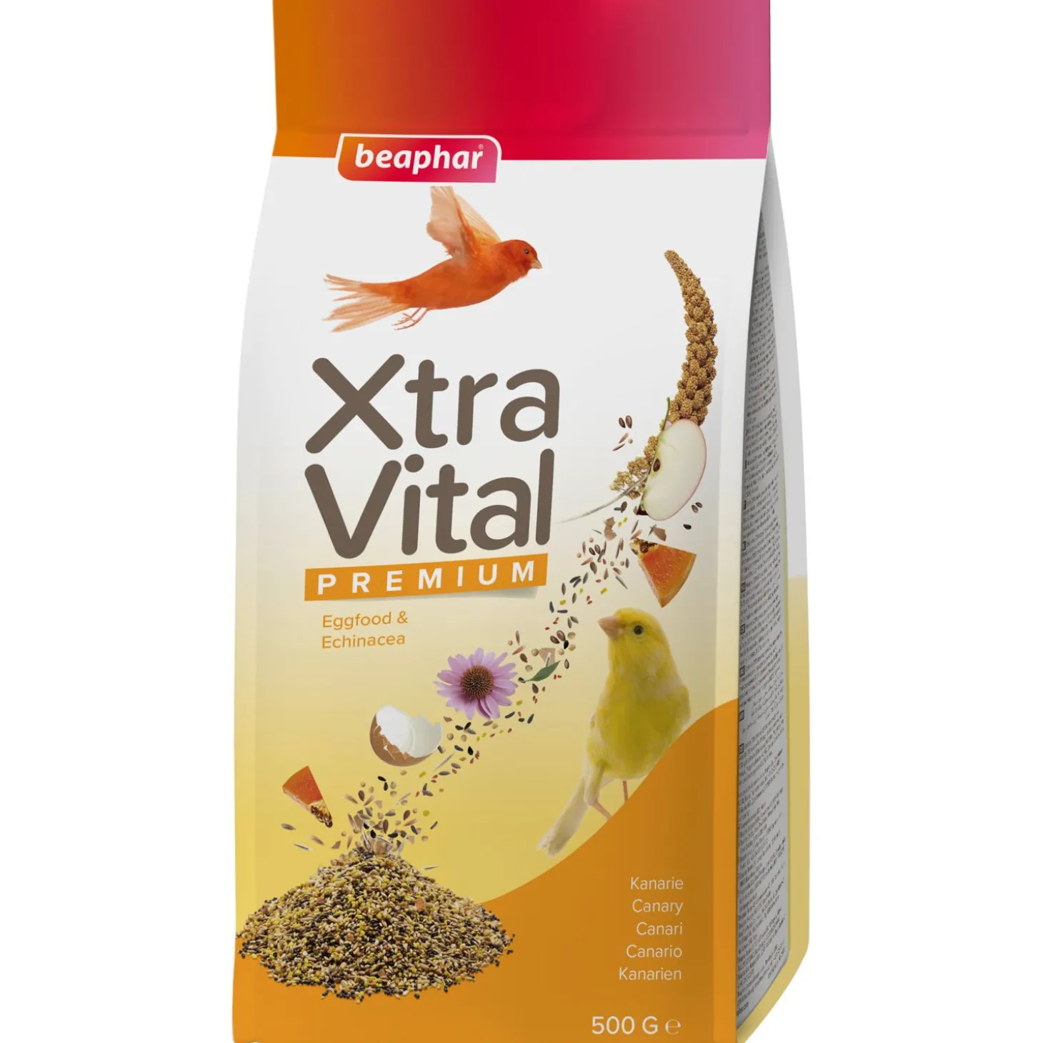 | Samenstelling | Zaden, bakkerijproducten, granen, mineralen, plantaardige bijproducten (0,5% gedroogde Echinacea), vruchten, suiker, oliën en vetten, ei en eiproducten (0,12%), gist |