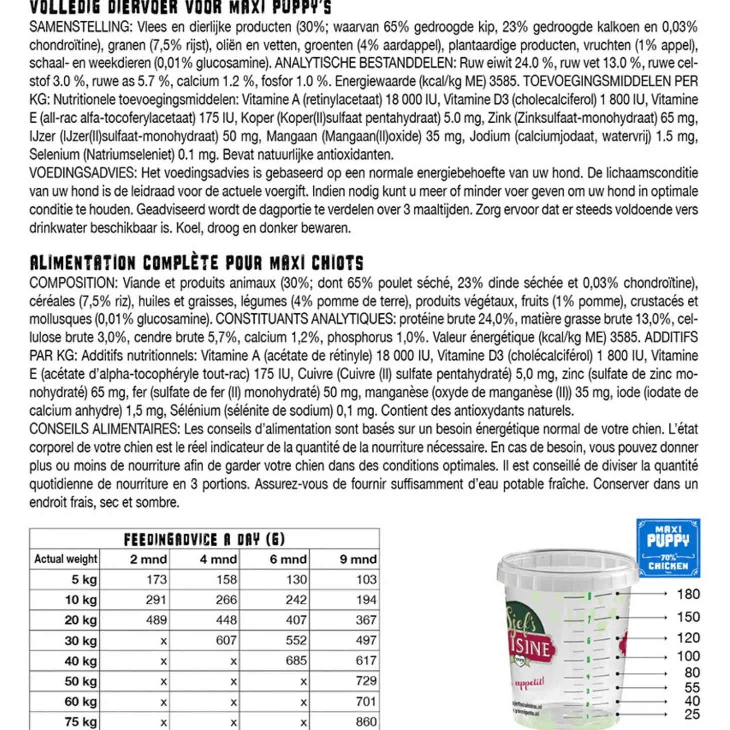 Sjef’s Cuisine Maxi Puppy is verkrijgbaar in 3 kg en 12,5 kg.